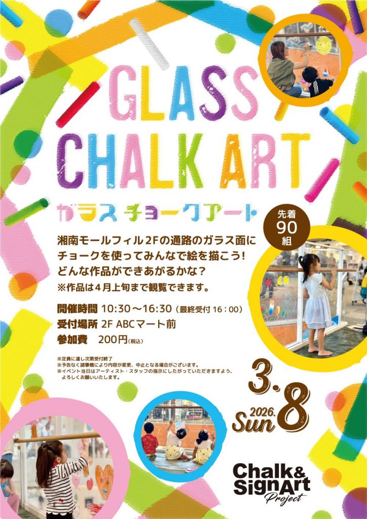 湘南モールフィル2Fの通路のガラス面にチョークを使ってみんなで絵を描こう!