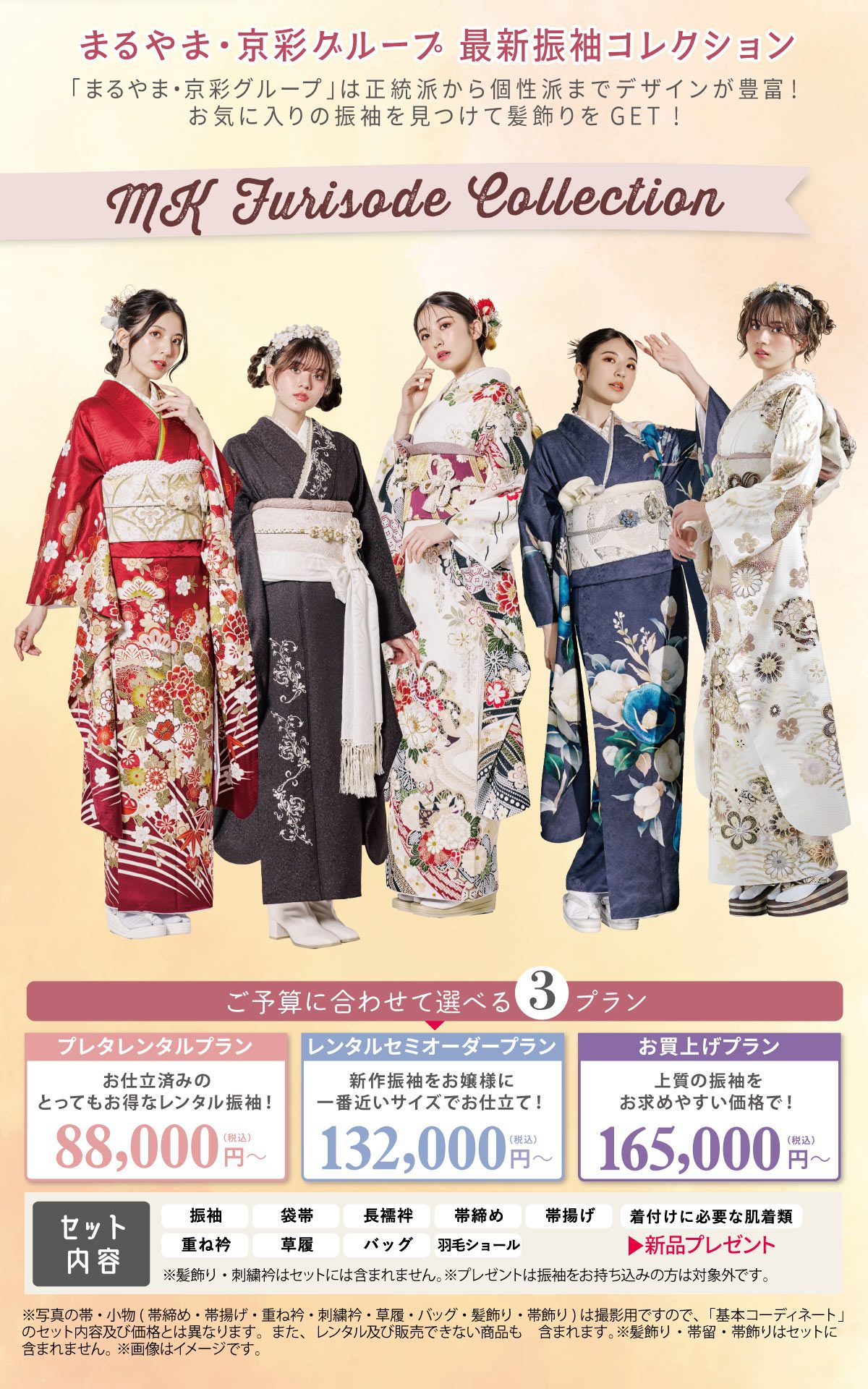 ※写真の帯・小物(帯締め・帯揚げ・重ね衿・刺繍衿・草履・バッグ・髪飾り・帯飾り)は撮影用ですので、「基本コーディネート」のセット内容及び価格とは異なります。